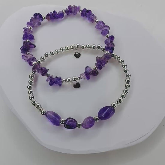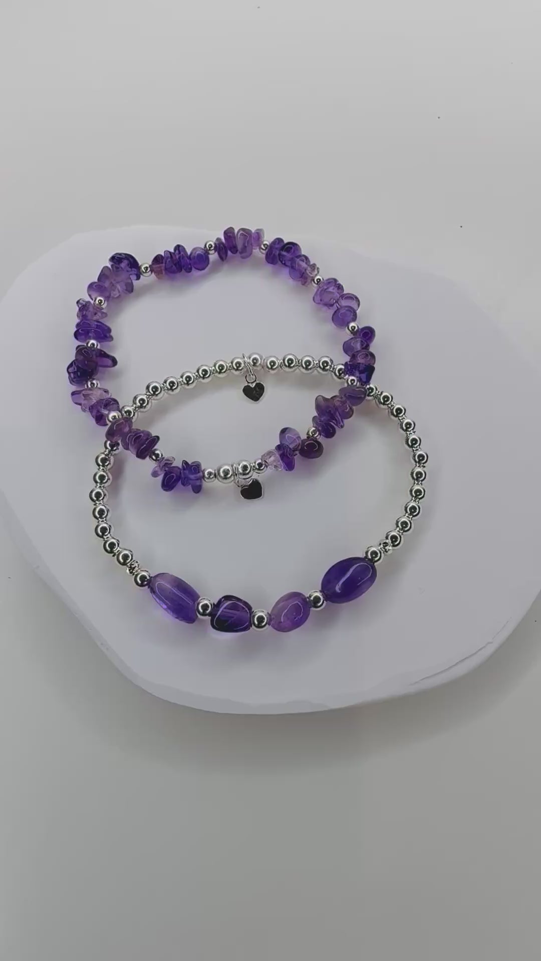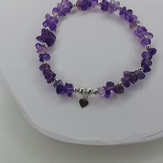 This bracelet is a made of Amerythst chips, so each hand made piece will look different due to the chips and the sizes. With sterling silver beads and finshed with the Sidney’s heart.