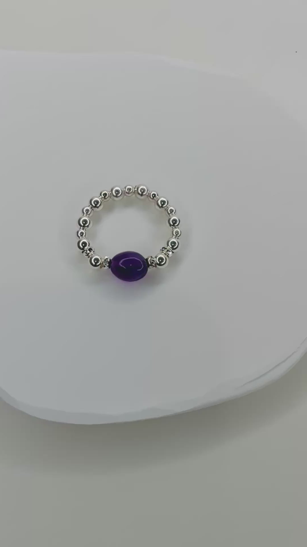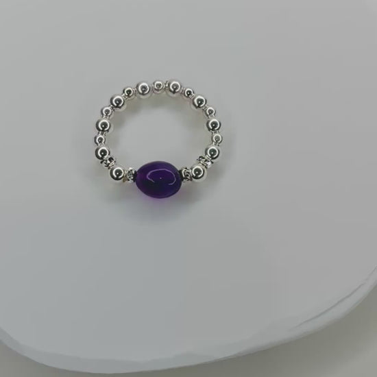 The amethyst stone ring is made on strong beading elastic and sterling silver beads. Lovely to wear on its own or to stack with the plain beaded stacking ring.
